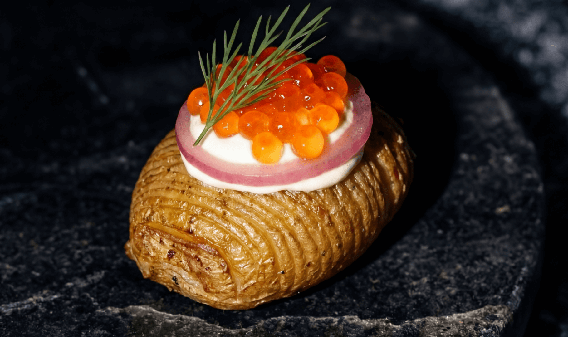 Hasselback potatoes with trout roe and zesty onion